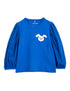 Bright blue top in soft cotton and airy tulle. Features white bunny graphic at left chest, tulle sleeves and crew neck.