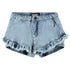 Feminine and edgy denim shorts that have become a customer favorite. Features two interior buttons to adjust size, zip fly and frayed ruffle hem on front and across back. Denim is soft with stretch for comfort.