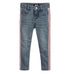 Classic slim fit denim with dusty pink velvet stripe down the sides. Features zip front, front and back pockets.