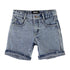 Denim cut off shorts with rolled bottom. Features classic front pockets and two bigger pockets at back. Hem can be worn rolled up or down.
