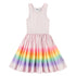 Pretty tank dress with major twirl factor. Features solid light pink ribbed racerback tank top and printed flared skirt with a rainbow design.