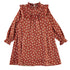 Gorgeous all over horse print dress in woven cotton with thin metallic stripes throughout. Features ruffle details, loose fit and a keyhole closure at back with a button.