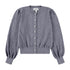 Pretty grey cardigan made of a wool and cotton blend. Features feminine balloon sleeves and pearl buttons on the sleeves and all the way down the front. Wide ribbing on the sleeves and at the waist, as well as ribbed edge around the neck.