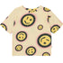 The coolest light yellow t-shirt with an all over print of smiley faces with a star in one eye. Fetures a rounded neck and boxy cut.