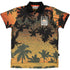 Cool orange and green polo t-shirt with a print of palm trees and a graphic sunset. Features a black collar and button closure. Made from 100% cotton.