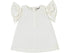 Soft denim colored top with cut out shoulders and ruffle sleeves. Features slightly loose fit through body and zipper at back for easy dressing.