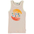 Cool neutral colored tank top with off white trim. Features colorful graphic with text "One World One Love." Pair with the Britney Skirt pictured for an understated cool look.
