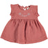Feminine, muted coral dress with beautiful pale blue-grey embroidery on chest. Two little birds with the text "Sweet" add detail to the front. Gathered front and full skirt make this an easy and comfortable style. Our favorite part is the thin open back slit with tie strings at top making it a speacial piece from all sides.