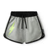 Cool grey swim shorts. Features a gym short cut, inner mesh lining, black trim, elasticized drawstring waist and neon lightning bolt for a pop of color.