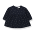 Cute printed baby dress in navy. Features a rounded neck, full button down back, and tiered body. Made of 100% cotton. Made in Spain.