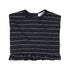 Feminine sleeveless tee in graphite with thin off white stripes. Features a crew neck, button closures at back and a small ruffle trim along the hemline.