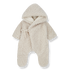 Unisex onesie in a plush faux shearling to keep your little one warm. Features a hood, wrap with tie front and is fully lined. Made in Spain.