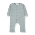 Soft stretch cotton ribbed romper. Features wooden button front, two small pocket details, cuffed hem and closed inseam.