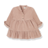 Micro cord long sleeve tiered dress in a pretty rose color. Features buttons down top of front.