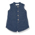 Deep denim sleeveless romper with contrast stitching. Features a thin stripe fabric, rounded neck, two back pockets and button front opening.