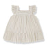 Pretty striped dress in neutral colors. Features a square neckline, ruffle trimmed sleeves, button down back and loose fit through the body.