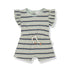 Adorable sage green soft cotton striped romper. Features flutter sleeves and a rope drawstring at the waist.