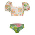 Pretty tropical print bikini. Features short puff sleeve and a reversible bikini bottom. The fabric has UPF50+ protection factor.