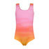 Reversible swimsuit in a classic cut. Features tank straps and a round neckline at the front and back. One side features a scattered sailboat print and the other a beautiful ombre of pink and orange.