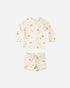 Two-piece rashguard set in an all over "aquatic" ocean inspired print. Featuring a long sleeve rashguard top and coordinating swim short bottoms with an adjustable drawstring.