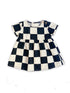 Cool natural colored cotton short-sleeved dress with black and white check print. Features a roomy fit, gathered skirt and natural colored button closure on shoulder.