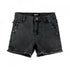 Washed black denim shorts with frayed edges and frayed trim on pockets.