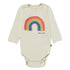Natural colored baby bodysuit with a rainbow design on the chest. The bodysuit has button snap closure at the neck and between the legs. A cute unisex style for everyday.
