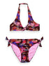 Tropical printed reversible halter bikini features pink and white striped reverse, tie side bottom, snap closure at back of top and tie detail at front. We love getting two suits in one - perfect to minimize packing on your little ones next travels!