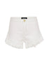 Feminine and edgy denim shorts. Features frayed ruffle hem on front and across back. Denim is soft with stretch for comfort.