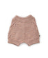 Heathered pink knit shorts with cable knit design on outside of legs.