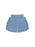 Denim washed tencel shorts featuring an elasticized waist and ruffle trim.