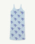 Pretty spaghetti strap dress with an all over print of blue birds on a light blue background. There is a small The Animals Observatory logo in yellow at left chest. Length falls below the knee for most children. Made from 100% cotton.