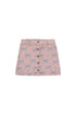 This taupe denim mini skirt with all-over bow print is made from 100% cotton. It has a button front and side pockets with an a-line shape, perfect for everyday wear.