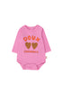 Super soft pink bodysuit with cute heart cookies graphic and text doux chamonix. Made from 94% organic cotton and 6% elastane for stretchy comfort.