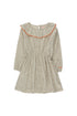 Small Dot print on a light cream base dress. It features a small Tiny embroidery on the sleeve. It comes with a round neckline, frilled collar with contrast finishing, an opening with a button on the back and an elasticated waistband and sleeve hem.