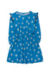 Pretty blue dress with all over "snow" print. Features elasticized cuffs, a gathered waist, rounded neck, ruffle trim shoulders with red embroidery and button opening at back of neck. Falls at the knee depending on height. Crafted from cotton poplin: 100% Cotton. Made in India.
