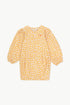 Fun yellow dress with allover star pattern. Features slight puffed sleeves, elasticized wrist cuffs, small pleats at the front, red "TINY" logo on chest and button keyhole closure at the back.