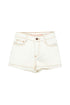 Off white denim short with contrast stitching. Features button at waist, zip front, and front and back classic pockets.
