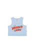 Cute cropped tank top. Features scooped neck and "Wonder Land" text in contrasting red and blue across the chest.