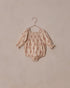 Pretty floral and swiss dot bubble romper. Features long sleeves, gathered wrist cuffs with ruffle detail, elasticized leg openings and snaps at bottom for easy changing. Smocking at front and back for comfort.