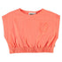 Cute cotton cropped top in neon coral. Features an elasticized waist and a cute xo smiley face at left chest.