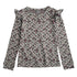 Deep grey long sleeve tee with all over liberty floral print. Features a crew neck and ruffle trim shoulders.