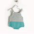 Adorable knit romper in grey and teal features button snaps at shoulder and bottom. A special piece to save and hand down when your baby grows.