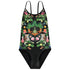 Swimsuit for active children in recycled polyester with UV protection 50+.The swimsuit has a regular fit, is fully lined, and has thin straps that cross at the deep back.It is black with a colourful jungle print.