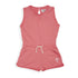Cute tank style romper. Features raw edges on top, natural colored drawstring at waist, gym style shorts, a long keyhole opening at back and small white logo with palm graphic on bottom left leg. Made from 100% cotton fleece.