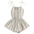 Chic grey and ivory striped romper with adjustable rope tie shoulder straps. Features a button front ad cinched, elasticizes waist.